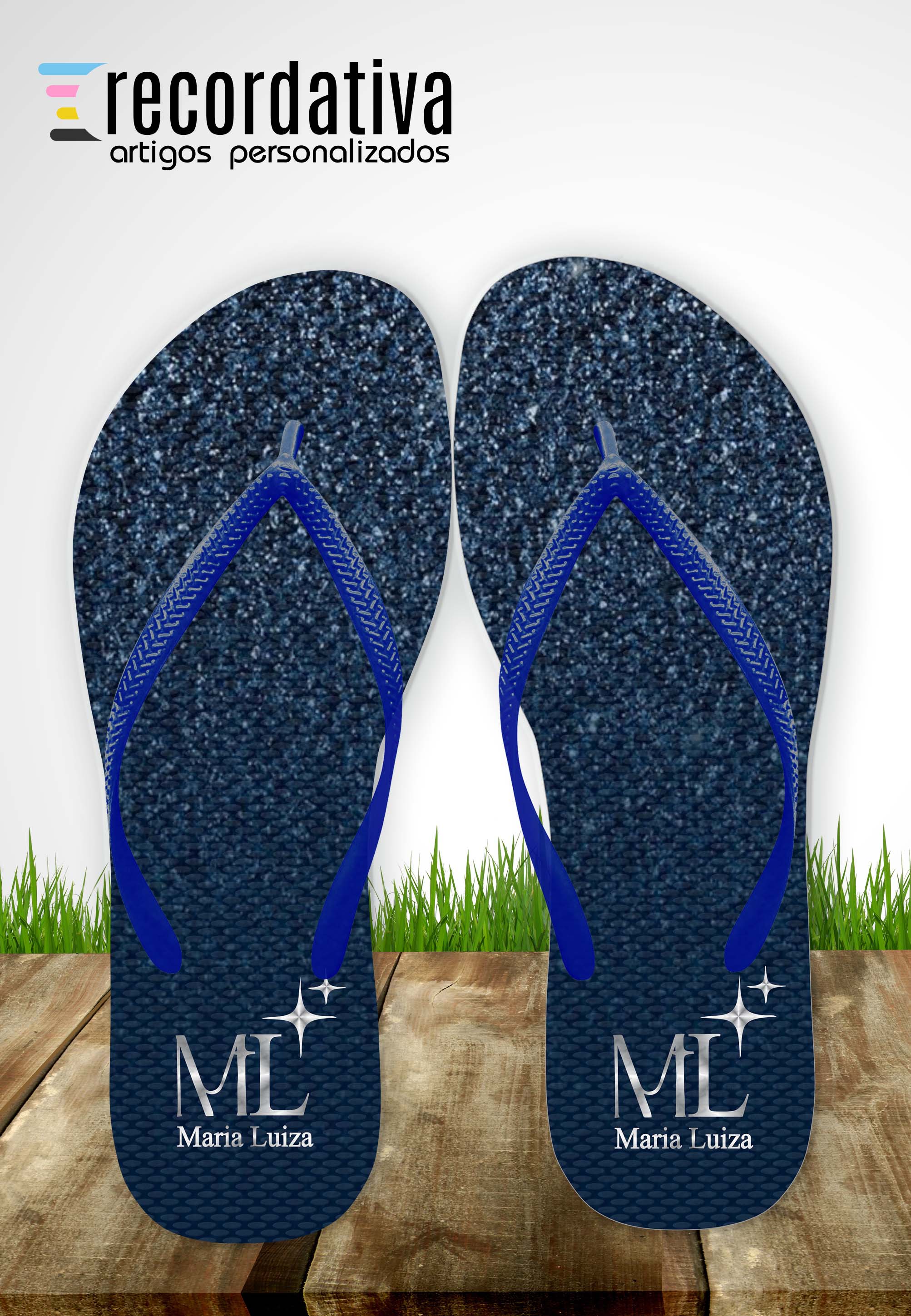 Chinelo personalizado debutante 15 anos com fundo azul marinho e efeito glitter prata e branco – DBT 102
